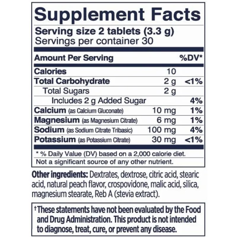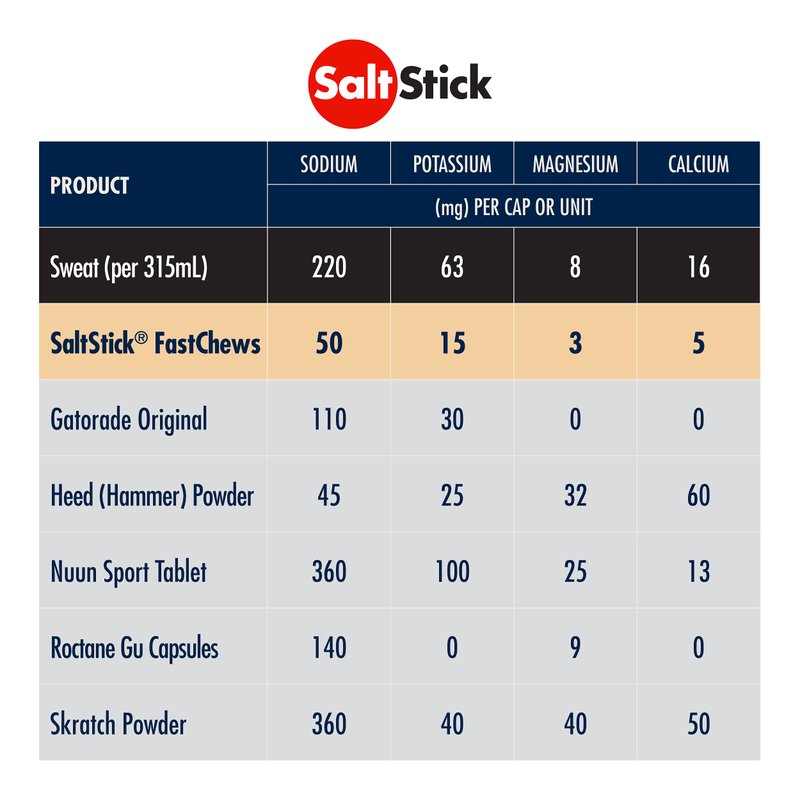 - Suggested use: 2 tablets per 15-30 minutes during activity, each tablet contains 50mg sodium, 15mg potassium, 3mg magnesium, similar to what the body loses through sweat