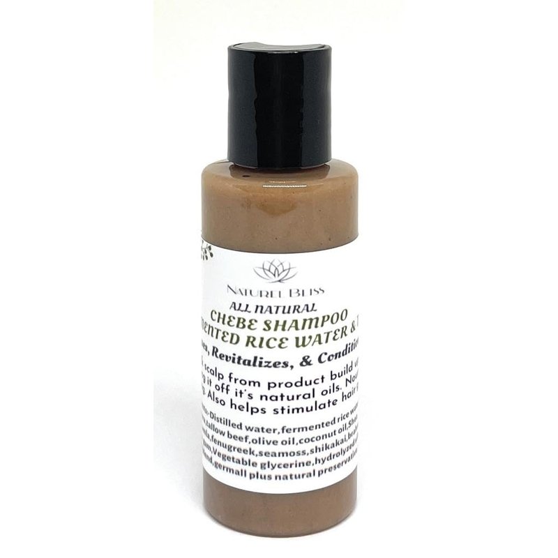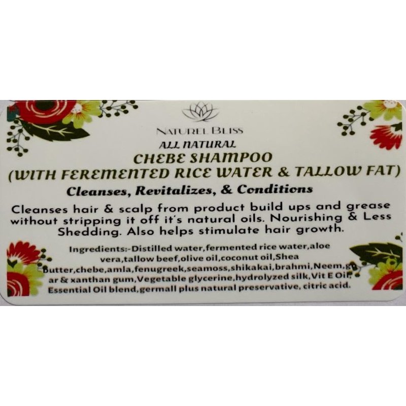 Chebe shampoo and conditioner made with fermented rice water & beef tallow.. A perfect ancient hair care kit for your wash day. [Shampoo ingredients:- ] Fermented Rice water, aloe Vera, distilled water, lye, sea moss gel, beef tallow, olive oil, coconut oil, Shea butter, Chebe, amla, fenugreek, brahmi, bhringraj, Neem, marshmallow root, shikakai, aritha, vegetable glycerine, guar gum, xanthan gum, tea tree oil, peppermint oil, optiphen plus, citric acid [Conditioner ingredients:- ]Distilled water, fermented rice water, beef tallow, BTMS 50, DL Panthenol, cetyl alcohol, Chebe, ambunu, fenugreek, flax seed, sea moss gel, karkar oil, hydrolyzed silk, peppermint oil, vitamin E oil, optiphen plus, citric acid.
