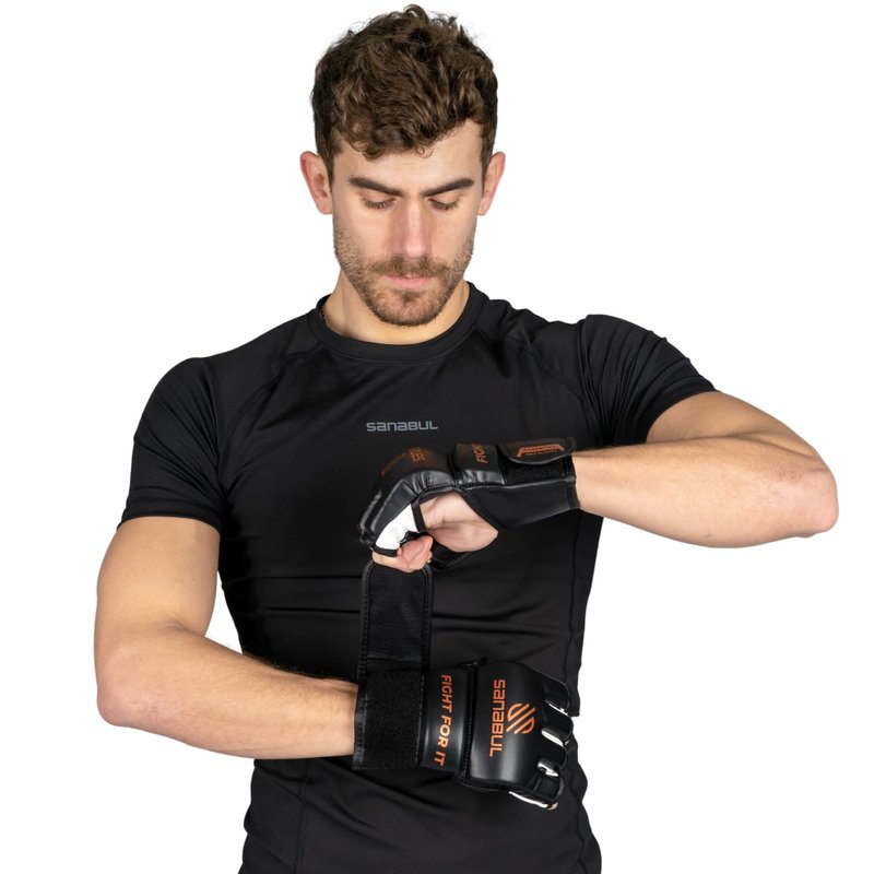 Elevate your MMA training experience with Sanabul Essential 4 oz MMA Gloves, the ultimate choice for both grappling and MMA sparring. Designed for the complete fighter, these gloves provide the perfect balance between hand protection during striking and full dexterity for grappling, eliminating the need to switch gloves mid-session. Our Essential Series is built for athletes who require high-quality gear that can withstand the demands of daily training, all while offering exceptional value. These gloves are not just another addition to your gym bag; they're an essential tool that's up to the task. We understand that professional gear should be tested by professionals. That's why we've had Team Sanabul, including elite fighters like Alan Jouban and Sean ""Sugar"" O'Malley, put our gloves through the most grueling training sessions. If they hold up for the pros, they'll undoubtedly meet your expectations. Constructed with Performance Engineered Leather, these gloves are designed to endure the test of time. This durable material is not only easy to clean but also provides long-lasting reliability, ensuring that your gloves remain a vital part of your training equipment. Gone are the days of fiddling with finicky gloves. Our innovative hook and loop closure system keeps the gloves securely in place for your entire training session, allowing you to stay focused on what matters – your training. Elevate your MMA experience with Sanabul Essential 4 oz MMA Gloves. Don't compromise on quality, value, or performance. Choose Sanabul, and make these gloves an essential component of your training routine
