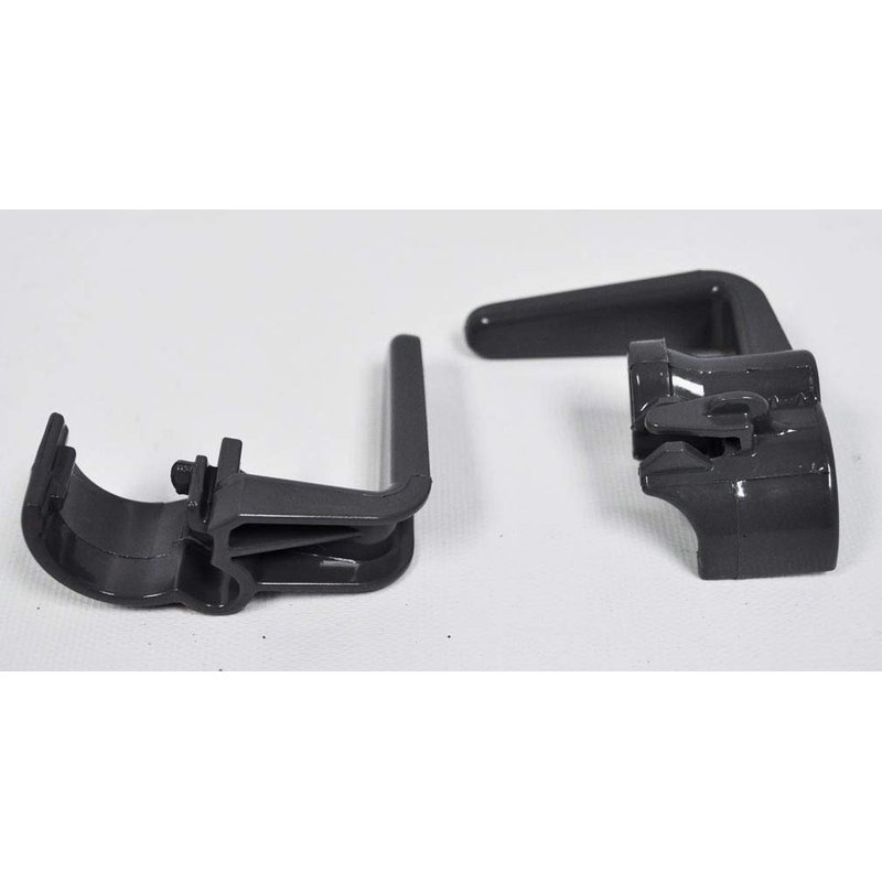 This cord hook set is used on multiple models of vacuum cleaners. The cord hooks are used to coil and hold the power cord while not in use. This part is made of a hard dense plastic. A lower and upper cord hook are included in this set. These cord hooks clip into place onto the handle tubes. Two flat head screwdrivers can aid in the removal of the cord hooks.
