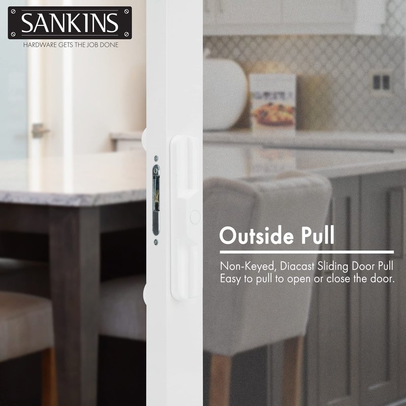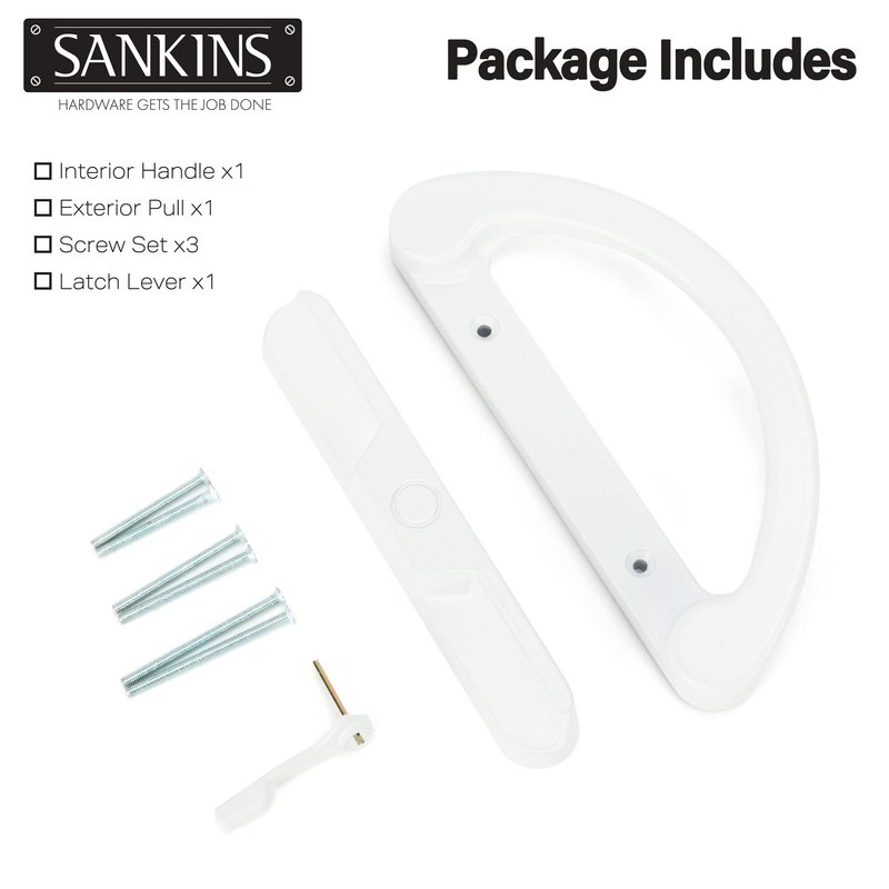 - [GREAT VALUE NON-KEYED PATIO DOOR HANDLE SET] SANKINS replacement patio door handle set comes with 1 interior handle, 1 exterior non-keyed non-locking pull, a thumb latch lever and 6 screws with 3 different lengths to fit various thickness doors (2x 1-3/4” Screws, 2x 1-15/16” Screws, and 2x 2-5/16”).