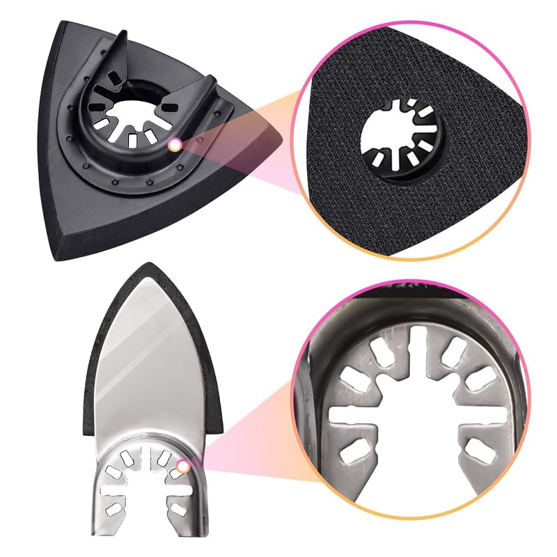 - Oscillating tool sanding pad kit: 2pcs Multi-Tool Triangle sanding pads , 100pcs 80mm x 80mm x 80mm triangular sanding papers,2pcs finger sanding pads , 100pcs 40mm x 50mm x 50mm finger sanding papers,and 2 C-clip adapter.