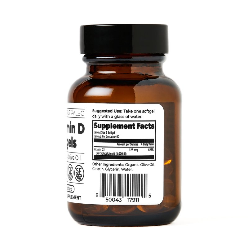 Santa Cruz Paleo Vitamin D Supplement, Bone Health & Immune Support, 5000 i.u. Per Softgel, Gluten Free, Keto, Sugar Free, Paleo, Vitamin D3, Olive Oil for Absorption, Natural Ingredients, 60 Softgels