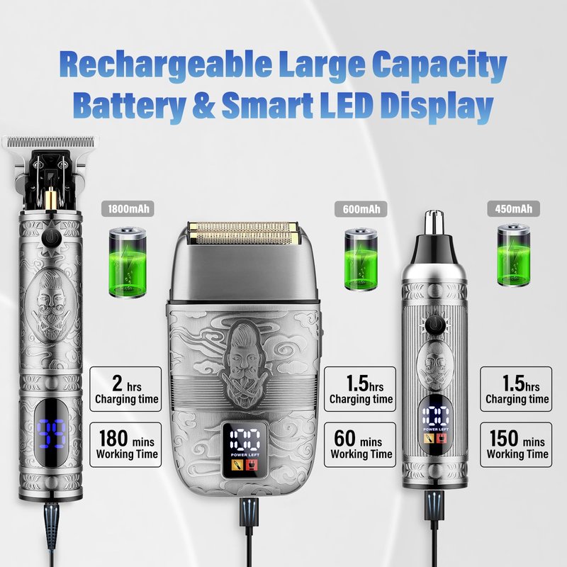 - 【Smart LED Display & Large Capacity Battery】The smart LED screen clearly displays the percentage of remaining power, reminding to charge and reminding to clean.Our trimmers have a built-in 1800mAh high capacity battery,if you charge it for 2 hours and can use it for 180 minutes.Nose Trimmer can trimming 150 minutes after for 1.5 hrs charging.This man's razor is suitable for home, travel, business or barbershop use.