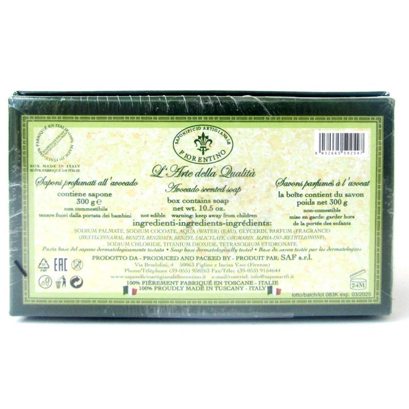 Saponificio Artigianale Fiorentino "Avocado" 10.5 ounces - scented soap bar. Proudly made in Tuscany - Italy. This beautifully boxed bar has the wonderful scent of fresh Florentine Avocado's and is gentle on the skin. Each bar moisturizes and cleans your skin with no chemical detergents. Perfect for a luxurious every day bathing ritual. Luxuriate in moisturizing, long lasting soap, known world-wide to be the ultimate in Italian quality.