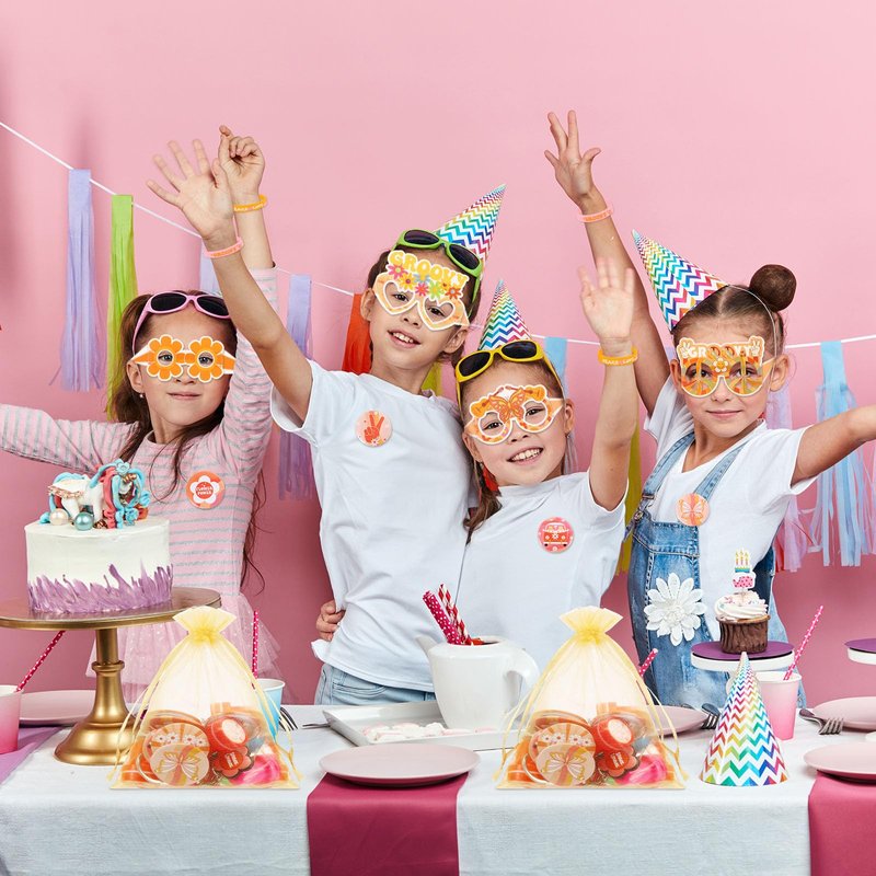 - Set Your Party Favors: you can use these hippie party favors to make your own party favor bag set; You just need to put the groovy wristband, groovy key ring, groovy badge, groovy glasses and groovy stamper into the organza gift bag with other party gifts; Then you can give them to the party members