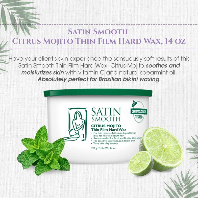 - INFUSED WITH NATURAL INGREDIENTS: Sink into soothing Citrus Mojito! Combines the benefits of vitamin C and natural spearmint oil which creates a perfect hair removal formulation for sensitive skin and delicate areas. Satin Smooth Citrus Mojito Thin Film Hard Wax calms and reduces adverse reactions such as redness or swelling on your skin during and after waxing. It also hydrates and nourishes your skin for that smooth, clear, healthy-looking skin you’ve always wanted.