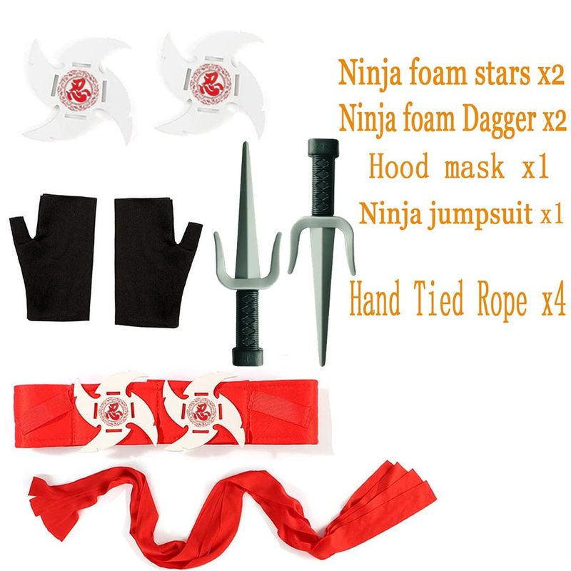- ๐๐Deluxe Ninja Costume Set: 1* mask, 1*ninja muscle bodysuit , 4*Straps, 1*Utility Belt, 2*Black Kids Gloves. and other foam/plastic accessories, and other accessories made of foam. Kids Stealth Ninja Costume for both Girls and Boys, With this ninja set, your baby will be the highlight of all occasions.