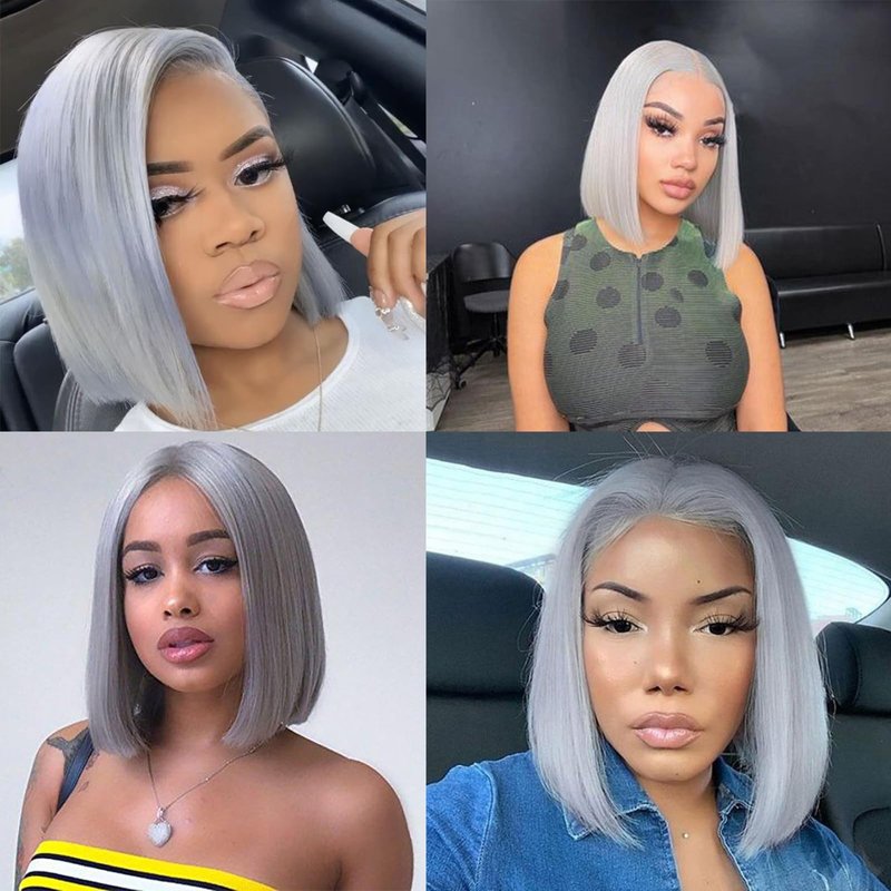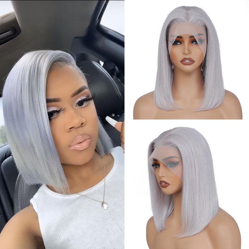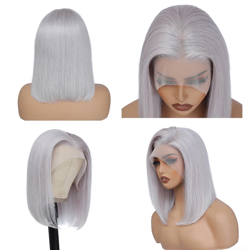 Savasana Grey Human Hair Bob Wig 13x4 Lace Front Glueless Wigs 180% Density 12 Inches Straight Bob Wigs
