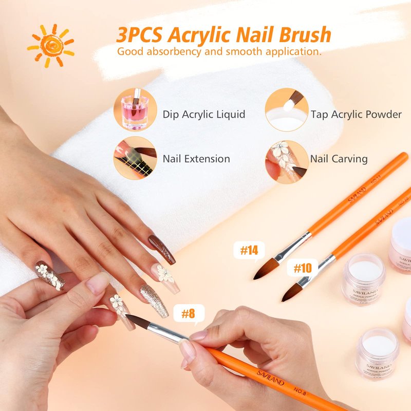 - 🍊Professional Acrylic Nail Kit: Saviland acrylic nail kit comes in 4 colors acrylic powder (Clear, White, Pink and Nudes), monomer acrylic nail liquid, non-acid PH bond, nail forms, acrylic nail brushes in 3 sizes, and other acrylic nail tools, so you can create a protective layer to strengthen your own natural nails, long-lasting for 4+ weeks. Perfect salon choice for beginners home DIY amazing nail art.