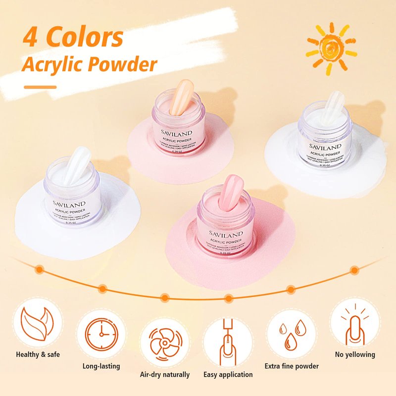 - 🍊4 Colors Acrylic Powder and Liquid Set: Saviland acrylic powder in acrylic nail kit is fine and non-clumping, acrylic nail powder contains no impurities, good adsorption properties. Nails kit acrylic set helps you to create natural, light and firm acrylic nails. Classic colorways create timeless styles that are suitable for all seasons and occasions.
