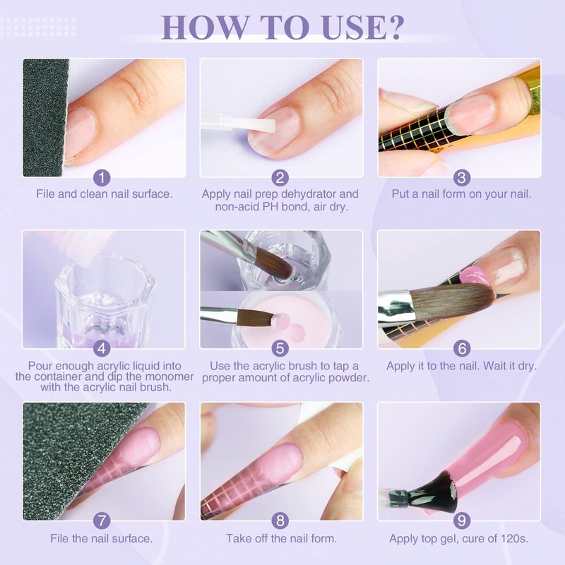 - Acrylic Nail Kit For Beginners: SAVILAND acrylic nail kit comes with clear/white/pink acrylic powder, an electric nail drill kit, 1*50ml acrylic liquid, 1*glass dappen dish, 1*acid-free PH bond, 1*no wipe top coat, acrylic nail brush (8/10/12) with different functions, 2pcs nail tools (nail file and buffer) and 100pcs nail forms and to meet the nail art needs, includes everything you need to get started acrylic nail art. This nail kit is compatible with gel nail polish and dip powder nail kit