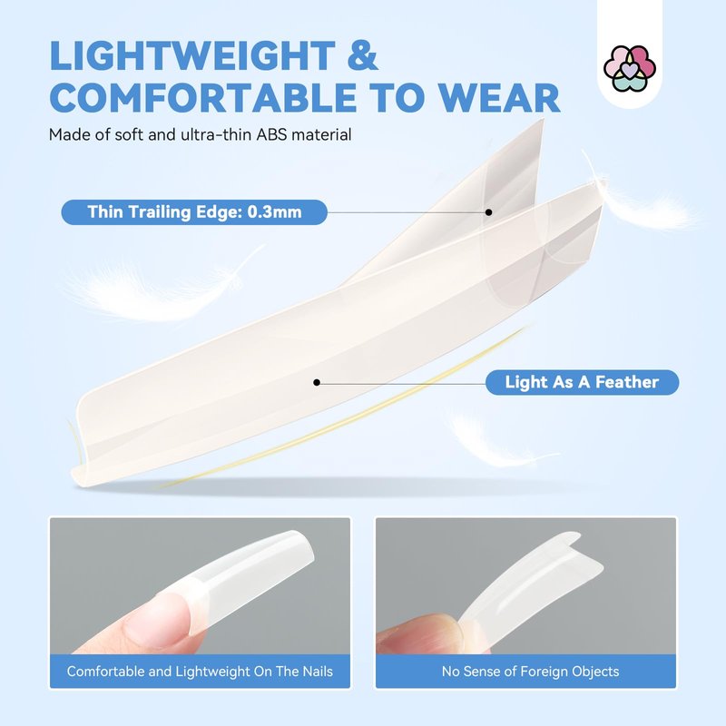 - šćThin, Durable, and ComfortablećExperience the blend of thinness, durable, and ultimate comfort with these acrylic tips. They offer enduring adhesion, excellent flexibility, all while adhering ergonomically to the body's natural structure. Perfect for gel x extension, acrylic nails, dip powder, builder gel nail art.
