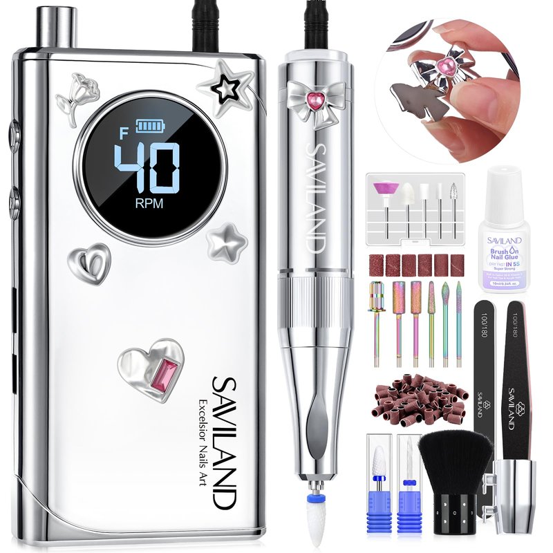 SAVILAND Electric Nail Drill Professional: 2024 Pro Future Tech 40000RPM Nail Drill Kit E File for Acrylic Nails Gel Polish Rechargeable 6000mAh Portable Nail Filer Drill Bits Salon Manicure Pedicure