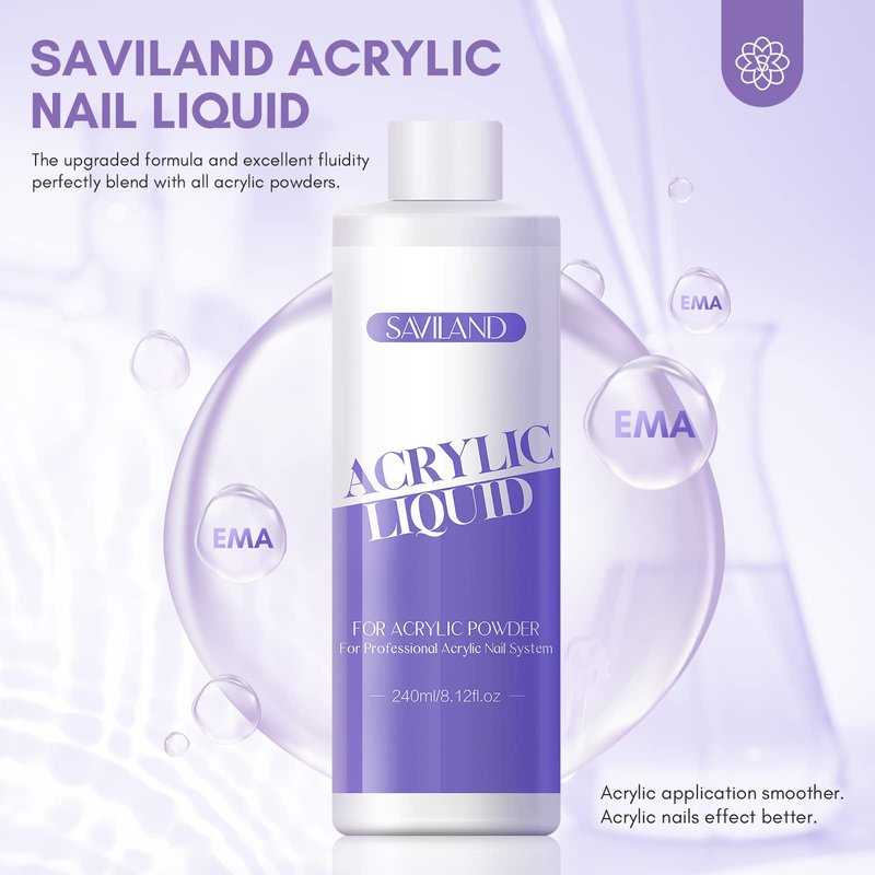 - 💧Premium Nail Liquid for Acrylic Nails: Saviland acrylic liquid is compatible with all acrylic powder and gives you optimal color clarity and finesse. Acrylic nail liquid adopts an upgraded version of formula, chip-resistant and non-lifting. While creating acrylic nails with acrylic powder, it's self-leveling and bubble-free with exceptional strength, durability and flexibility.