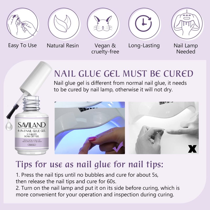 - PREMIUM QUALITY & HEALTHY: SAVILAND glue gel for nails is made from natural resin and healthy ingredients, colorless, mild and non-irritating odor, no impurities,and harmless to nail & skin,providing you a comfortable and pleasant nail experience