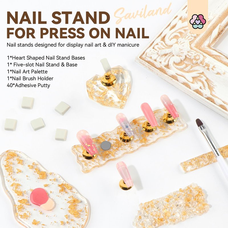 - ✨【Essential Tools for DIY Nail Enthusiasts】 SAVILAND press-on nail stand set comprises a heart-shaped nail stand base, a five-slot nail stand & base, 40 pcs of adhesive putty, a nail art palette, and a nail brush holder. This nail stand provides a stable base for precise and clean nail application, eliminating the need for unreliable surfaces and finicky nail placements.