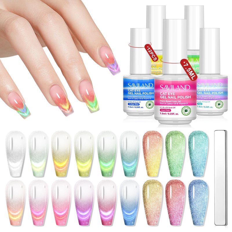 - 🧡【Gorgeous Cat Eye Gel Nail Polish】 Saviland cat eye gel nail polish set, includes 12 pcs cat eye gel nail polish, the color is two-color glitter cat-eye effect, which can reflect different sparkle effect in different light and angles. Add an extra silver color for easy matching and application with other colors, creating a more unique cat eye effect.