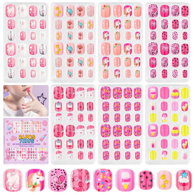 - 7 Pack Press on Nails for Kids: SAVILAND kids press on nails come in a diverse array of 7 styles and designs and total 168 pcs to cater to different preferences for your girls, can change different manicure styles as you like within a week. These press nails for kids are special for children of 8-12 ages