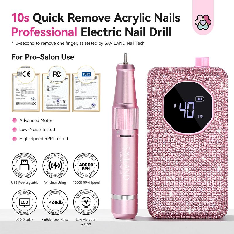 SAVILAND Professional Nail Drill 40000 RPM: Portable Diamond Nail Drill Kit Rechargeable 4000 mAh Electric Nail File for Thick Acrylic Nails with Ceramic Nail Drill Bits Sanding Bands Nail Tech Salon