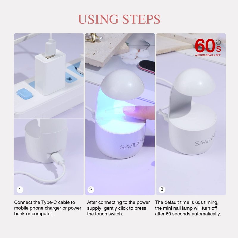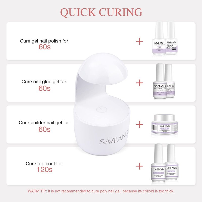 - 💅[MINI U V LED NAIL LAMP]-Saviland gel x lamp is a gel nail polish dryer for nail art. The product's packaging contains a user manual, a Type-C cable, and the U V mini nail lamp. Small size and lightweight, small enough to be placed without taking up space. Curing various U V nail gels, such as gel nail polish, builder nail gel, nail glue gel and so on.