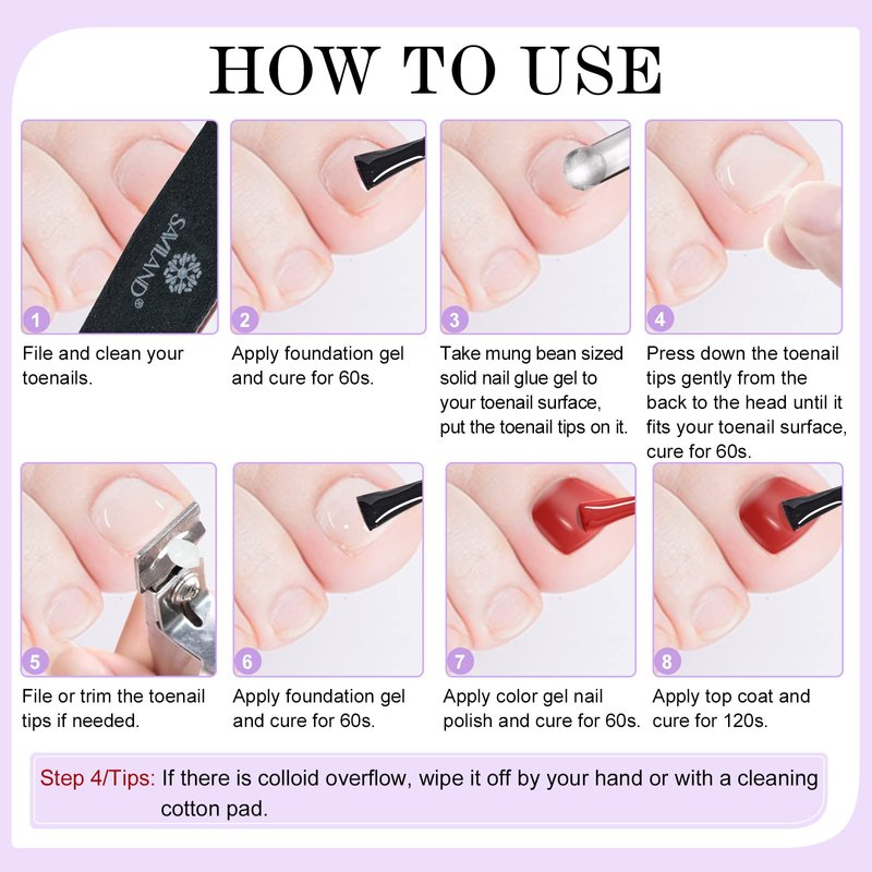 - ❤【PERFECT TOENAILS & SOLID NAIL GLUE GEL KIT】Saviland toenails and solid glue gel kit includes 500pcs fake toenail tips, 1pc 15ml solid nail glue gel, 1pc 10ml base coat, 1pc10ml top coat, 1pc mini U V LED nail lamp, 1pc nail file, 1pc nail buffer, 1pc cuticle pusher, 2pcs nail separator. You will enjoy the beauty of making DIY toenails art and have a good mood from using this kit.