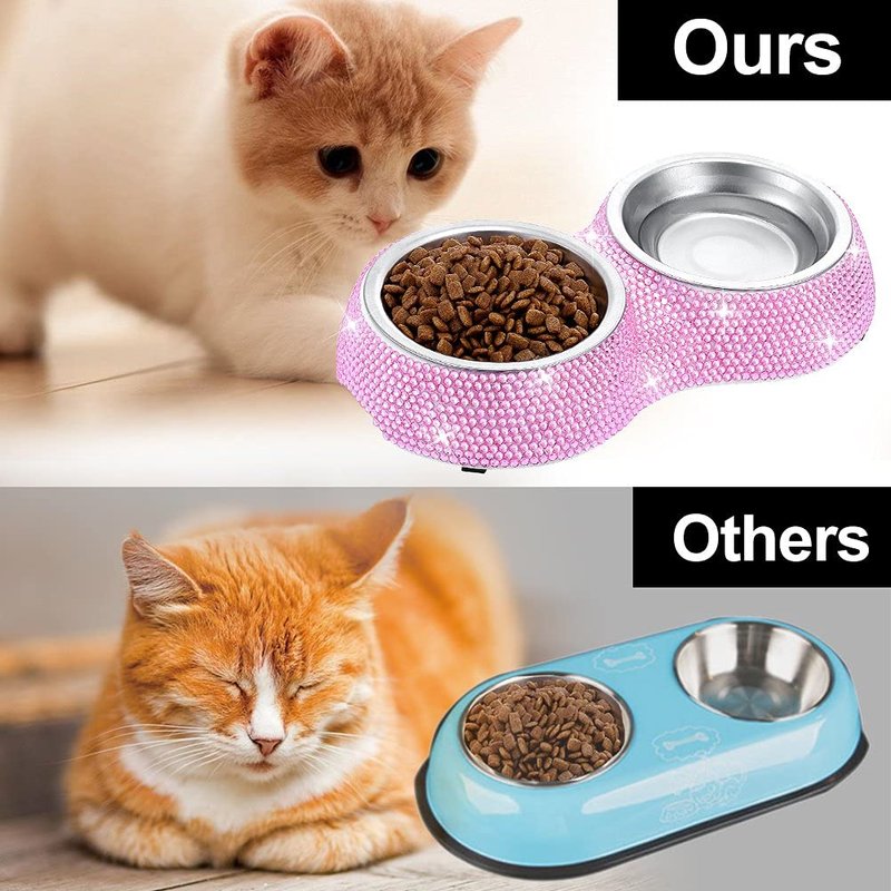 - ☛[ Handmade Rhinestones & Large Capacity ] - Our Dog Bowls are made of Handmade Sparkling Rhinestones Material ,320ml in total Capacity (160ml for each bowl).
