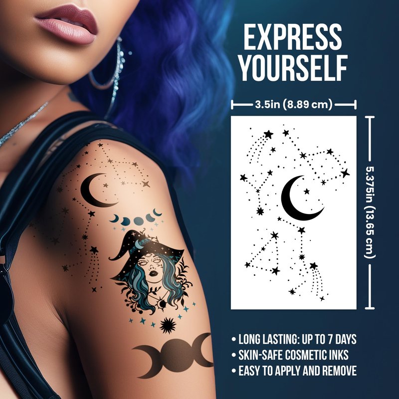 - TAKE A COSMIC JOURNEY: Inspired by the celestial allure of the night, these tattoos are not just accessories. Whether you're feeling constellation vibes, witchy wonders, or pure Queen sass, this collection has got you covered in the most magical ink possible.