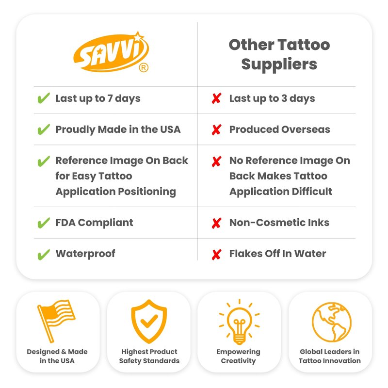 - SKIN-SAFE INK: We use skin-safe, cosmetic-grade, and FDA-compliant ink, so these tattoos are as safe as they are fun, and great for all ages.