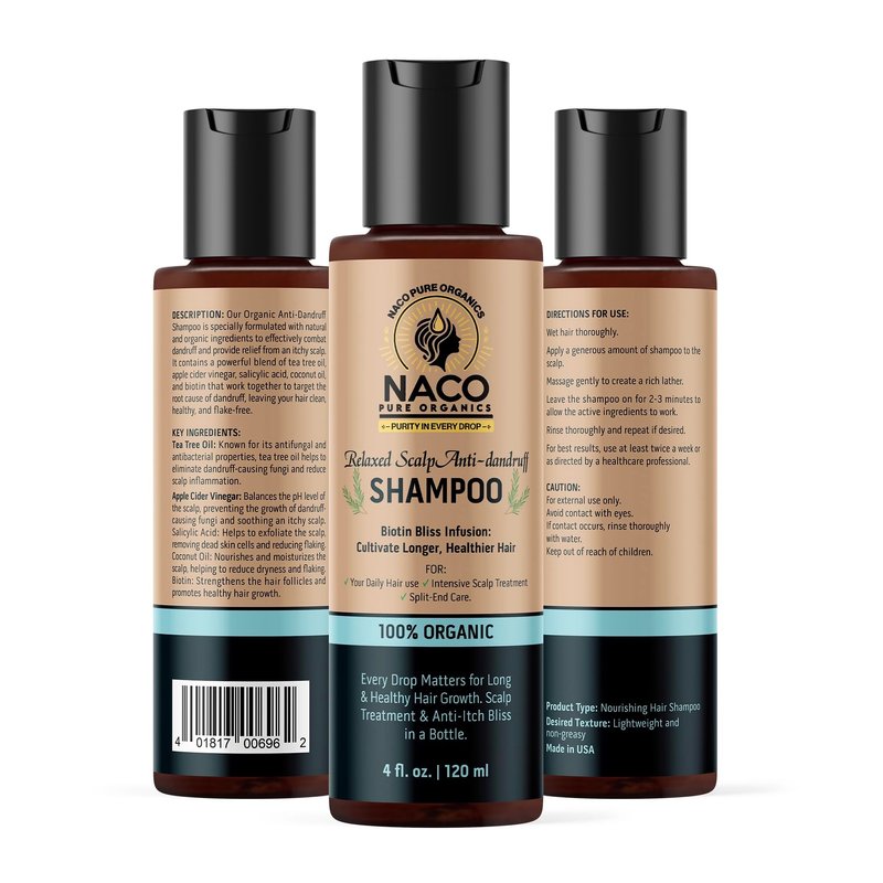 Discover the natural solution to dandruff with Naco PureOrganic Anti-Dandruff Shampoo. Our carefully crafted formula targets the root causes of dandruff, combining the prowess of Tea Tree Oil with the exfoliating benefits of Salicylic Acid to reduce flakiness and soothe your scalp. Coconut Oil and Omega-3 Fatty Acids deeply moisturize, preventing dryness, while Apple Cider Vinegar ensures your scalp maintains its ideal pH for health and balance Designed for daily use, our shampoo respects your hair's natural integrity, offering a gentle yet effective cleansing that revitalizes both your scalp and hair. Free from the harsh chemicals that can exacerbate scalp issues, Naco PureOrganics is your path to a dandruff-free life, with the added benefits of softer, shinier hair.