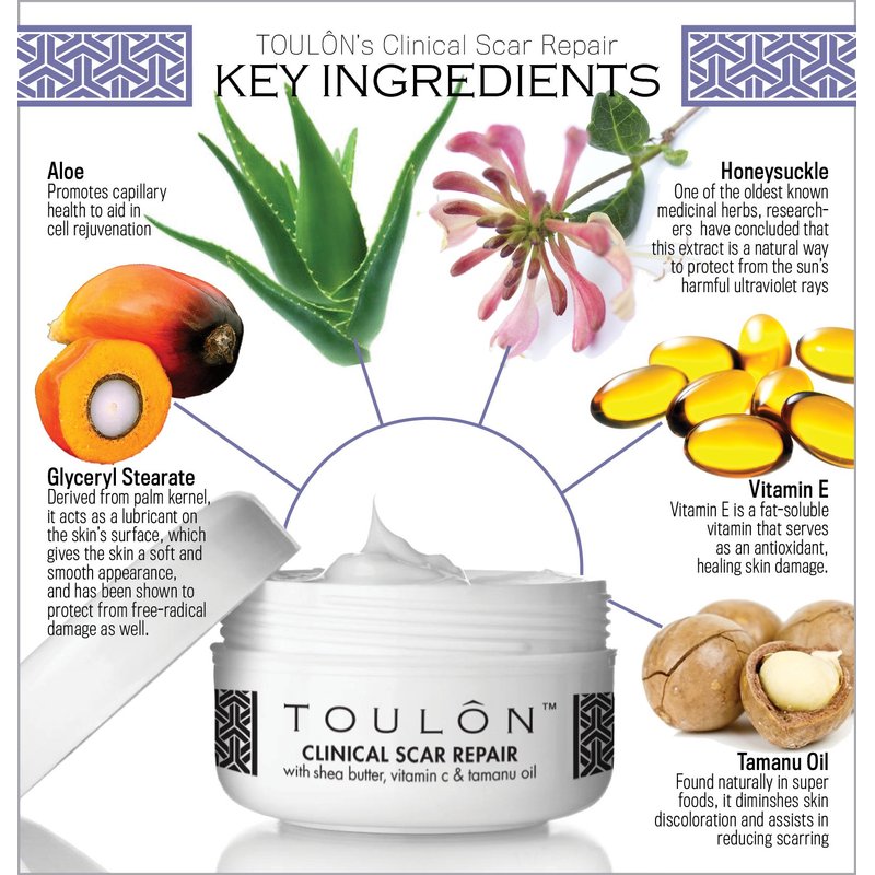 - ORGANIC: Our Proven, Clinical Scar Treatment Uses 100% Pure Vit E & C,, Safflower Oil, Oil of Tamanu, Shea Butter, Aloe Vera, Honeysuckle, Palm Oil, Antioxidants & Wheat Germ Oil.
