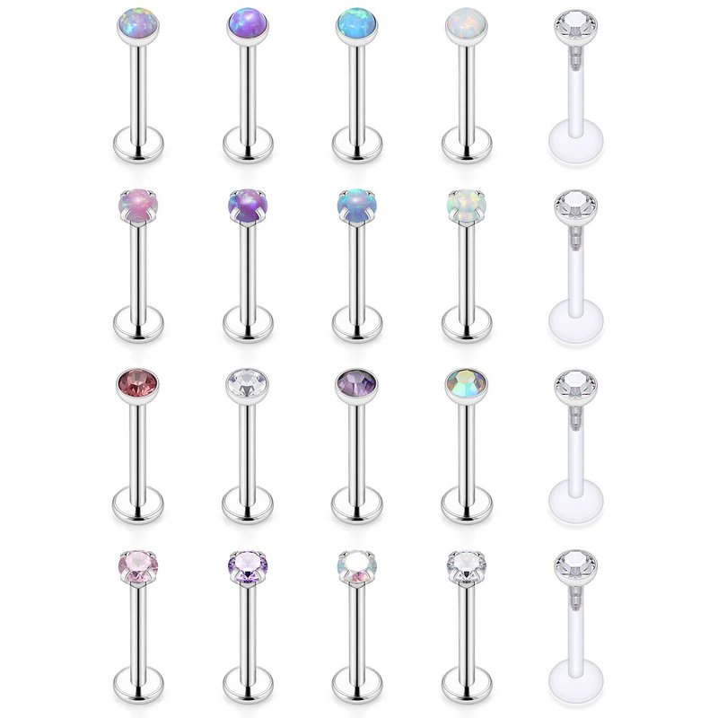 SCERRING 20PCS 16G 8mm Stainless Steel Labret Monroe Lip Ring Tragus Nail Helix Earring Stud Piercing Jewelry with 2mm Clear CZ Opal