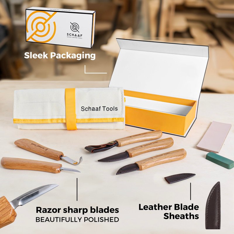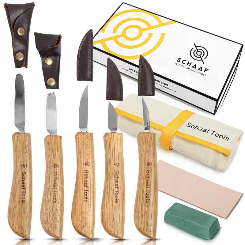 Schaaf Wood Carving Tools Deluxe Wood Carving Kit includes 5 premium quality wood carving knives: A Detail Whittling Knife, Chip Carving Knife, Sloyd Wood Carving Knife, and two differently contoured Spoon Carving Knives. This is a perfect adult crafts wood whittling kit, suitable for beginners, hobbyists and even professionals. The wood carving knife set also comes with a premium leather knife sheath to protect each blade, a leather strop and honing compound, and a durable canvas tool roll. Happy carving!