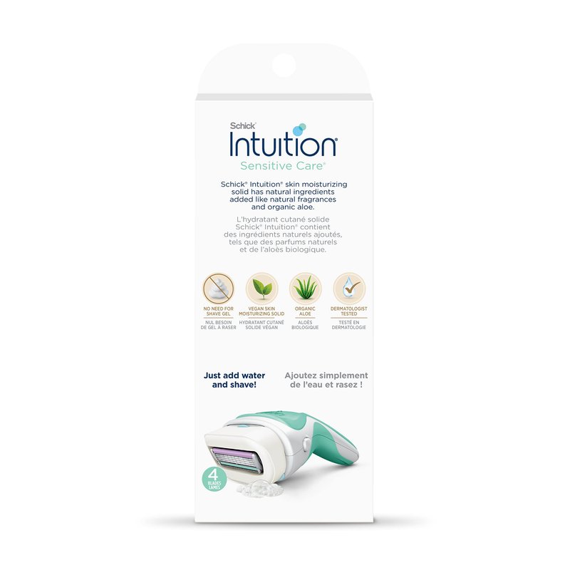 - Schick Intuition Sensitive Care Razor kit includes 1 razor handle, 1 razor cap and 2 razor blade cartridges