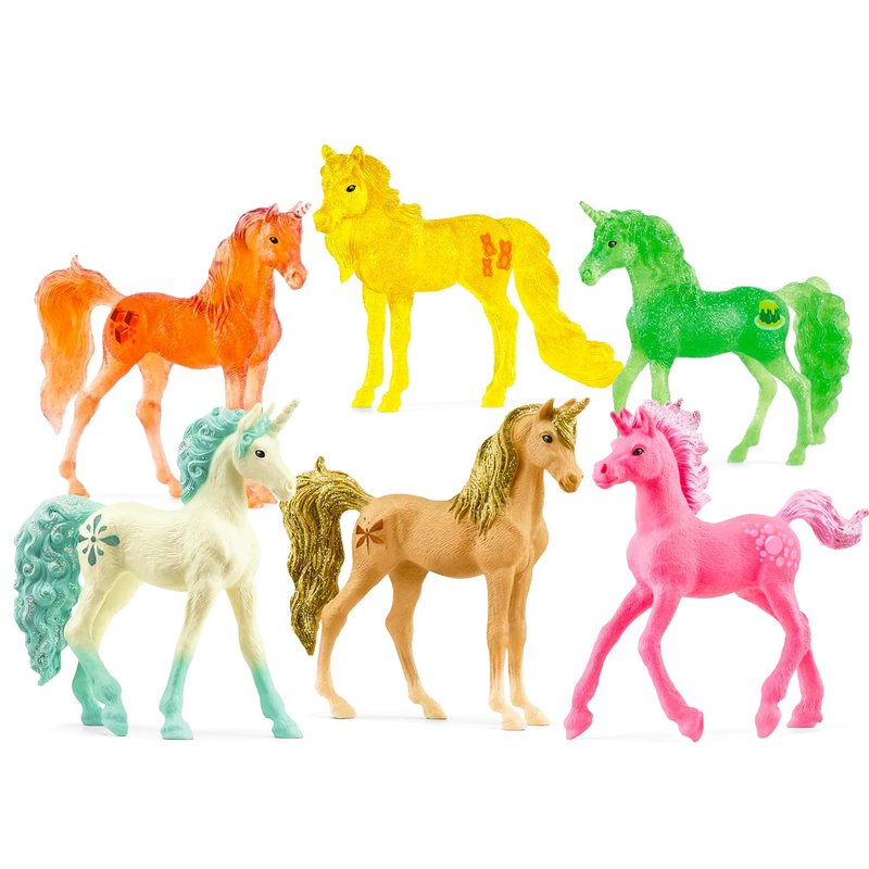 - This Schleich unicorn playset comes with 6 unique unicorn toy figures: 1 Jelly Fruit unicorn, 1 Caramel unicorn, 1 Gumdrop unicorn, 1 Bubble Gum unicorn, 1 Amber unicorn, and 1 Aquamarine unicorn.