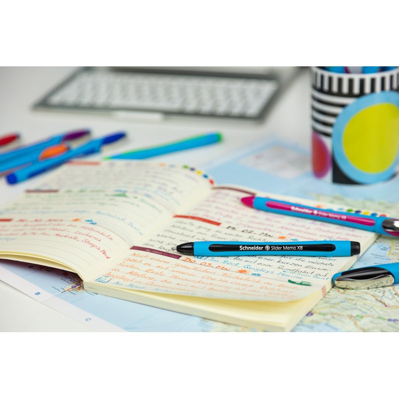 Schneider Slider Memo XB (Extra Broad) Ballpoint Pen, 1.4 mm, Light Blue Barrel, Violet Ink, Box of 10 Pens (150208)