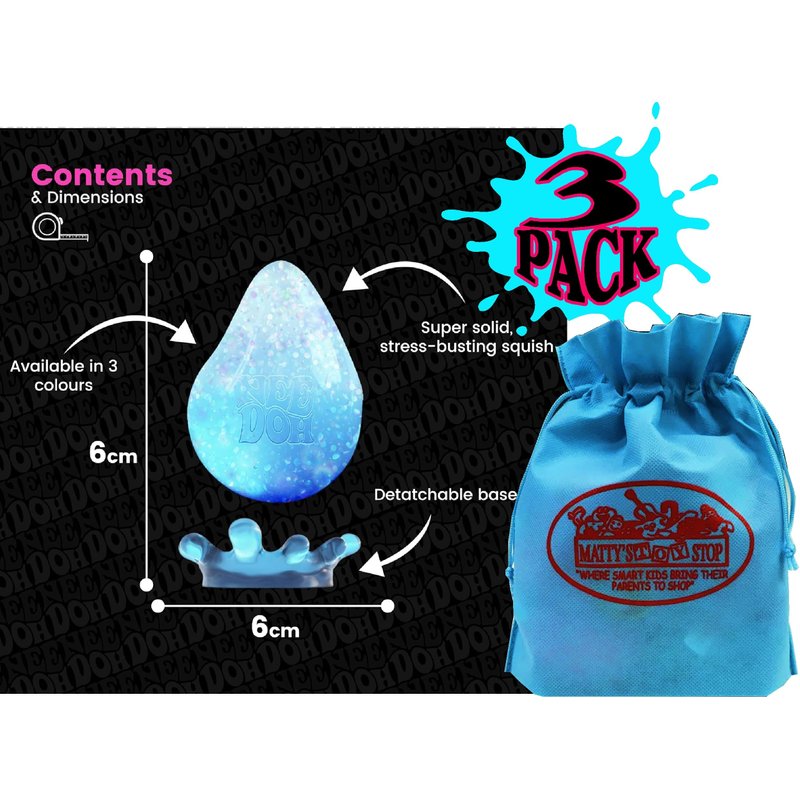 Relax, unwind, and find your groove with the Schylling Nee Doh Dream Drop! This 3-pack of BLUE translucent Groovy Glob fidget drops is designed to melt away stress with every squish and squeeze. Each Nee Doh Dream Drop in this set (blue) is filled with a mesmerizing sparkle filling and a unique groovy shape that creates a relaxing, sensory-smooth experience every time you hold it. It’s the perfect companion to help you stay calm and focused, whether at home, school, or the office. Ideal for all ages, the Dream Drop makes an excellent gift, party favor, or stress relief tool for people of all kinds, including those with ADD, ADHD, OCD, autism, or anxiety. Its hypoallergenic, BPA-, phthalate-, and latex-free design makes it safe for everyone. Plus, it’s easy to clean—just rinse with soap and water! The included splash display stand and Matty's Toy Stop storage bag keep your Dream Drops ready for action wherever you go.