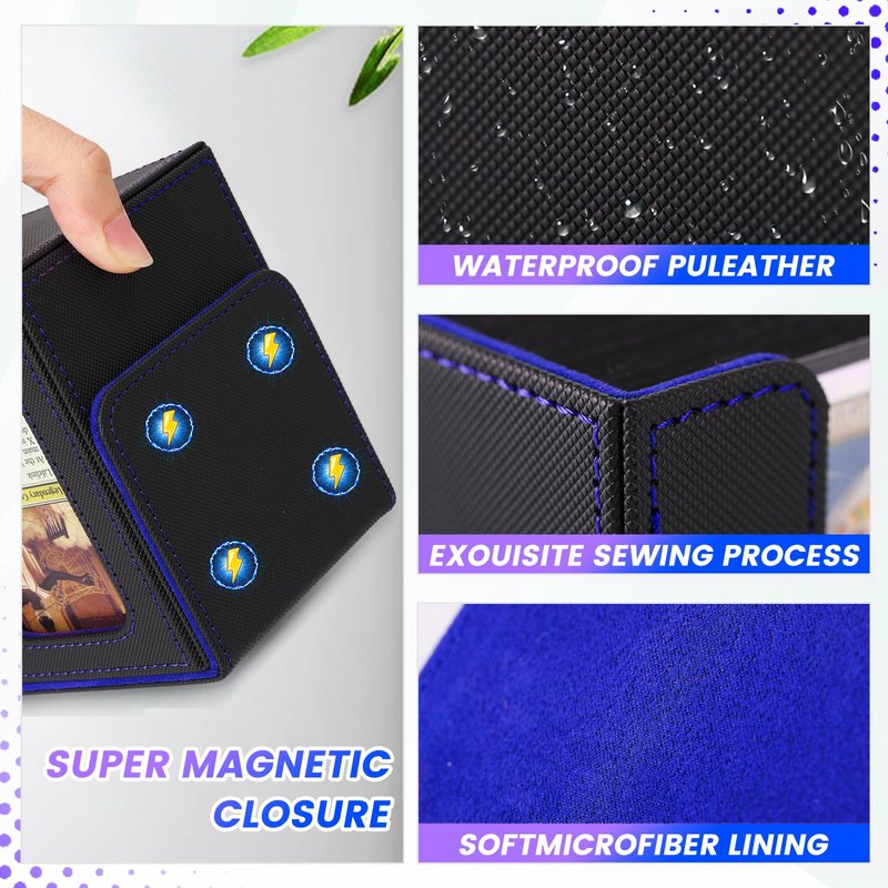 Scimi MTG Deck Box for Commander Display,Card Deck Box Fits 100 Double Sleeved Cards, Magic Commander TCG Card Leather Storage Box with 2 Dividers and 1 Toploader (Black/Blue)