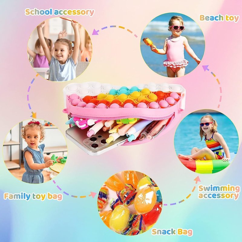 - Playable Pretty Colors and Soft Stress Relieving Fidget Toys -SCIONE pop purse bag comes equipped with a detachable pop pouch made from safe silicone material. Press it, and watch it rebound instantly! Perfect for keeping kids focused and maintaining inner calm during stressful moments.Rainbow purse can be used as a grils purse with clothing or stress relieving fidget toys.