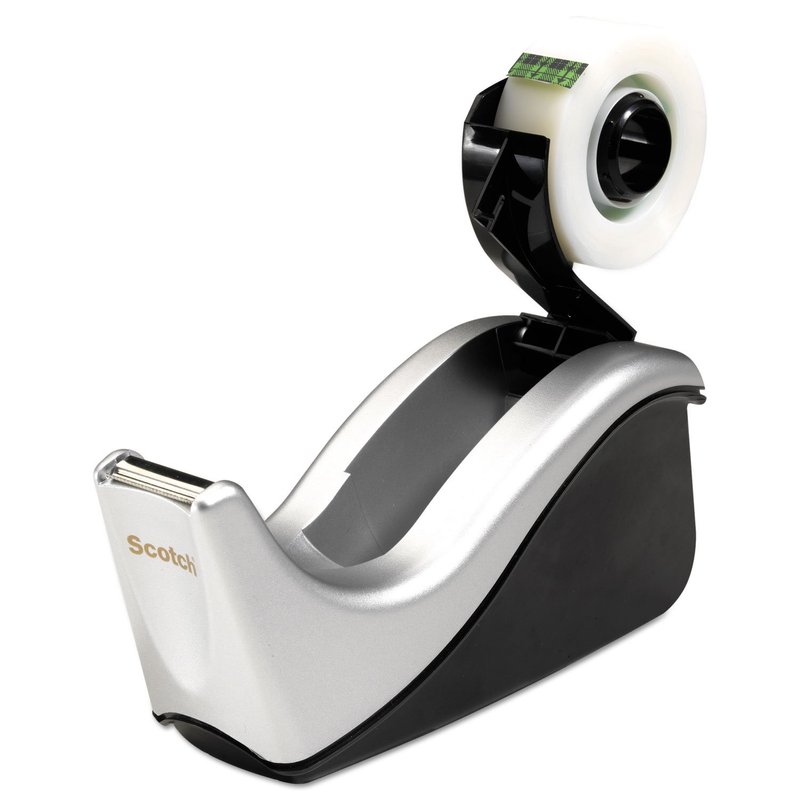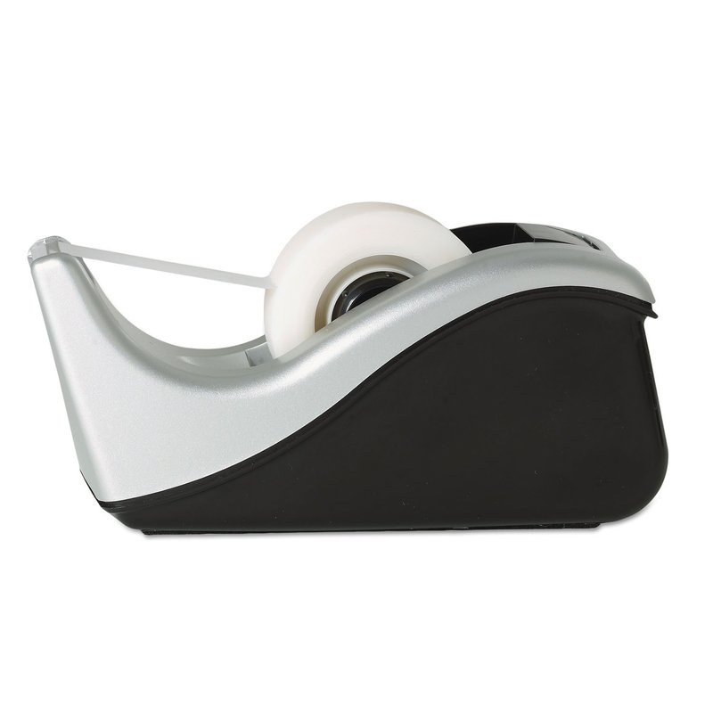 - Deluxe two-tone silver/black desktop tape dispenser with weighted base