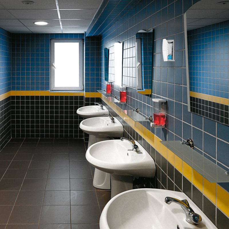 - The small wall mount dispenser (2.8" x 5" x 2.4") blends into your environment and works with any bathroom or break room décor