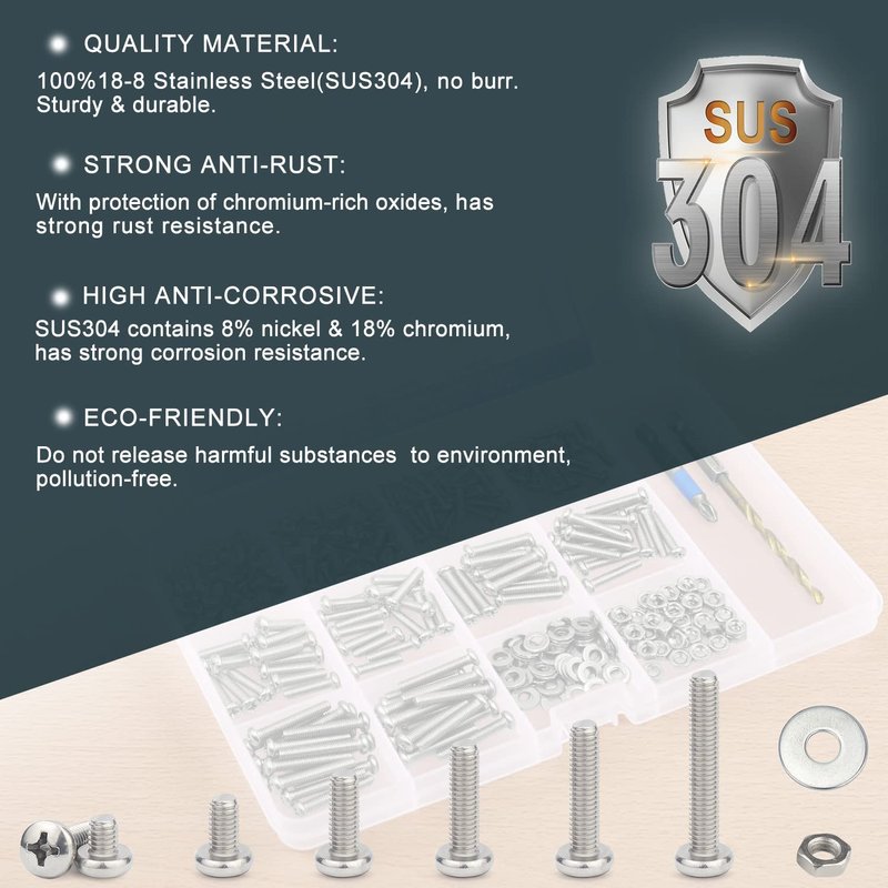 - QUALITY MATERIAL: Our assorted bolts & nuts are made of stainless steel 304(SS304), anticorrosive & rustproof, sturdy & durable.