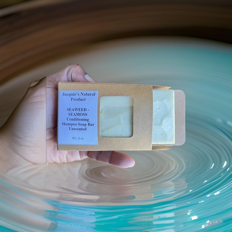 The Sea-Weed Sea-Moss shampoo conditioming soap bar is a naural hair care product infused with nutirent-rich ingredients. It is designed to gently cleanse the hair, scalp and body while providing nourishment and hydration to the hair. The bar contains a blend of hair moisturizing oils, milk and natural clays such as coconut oil, avocado oil, Bentonite Clay and Almond milk to promote hair health. The soap is rich in vitamins, minerals and antioxidants, which nourish and stengthen the hair follicles, promoting healthier and shiner hair. It is convenient, eco-friendly, and free from harsh chemicals, making it a sustainable choice for hair care.