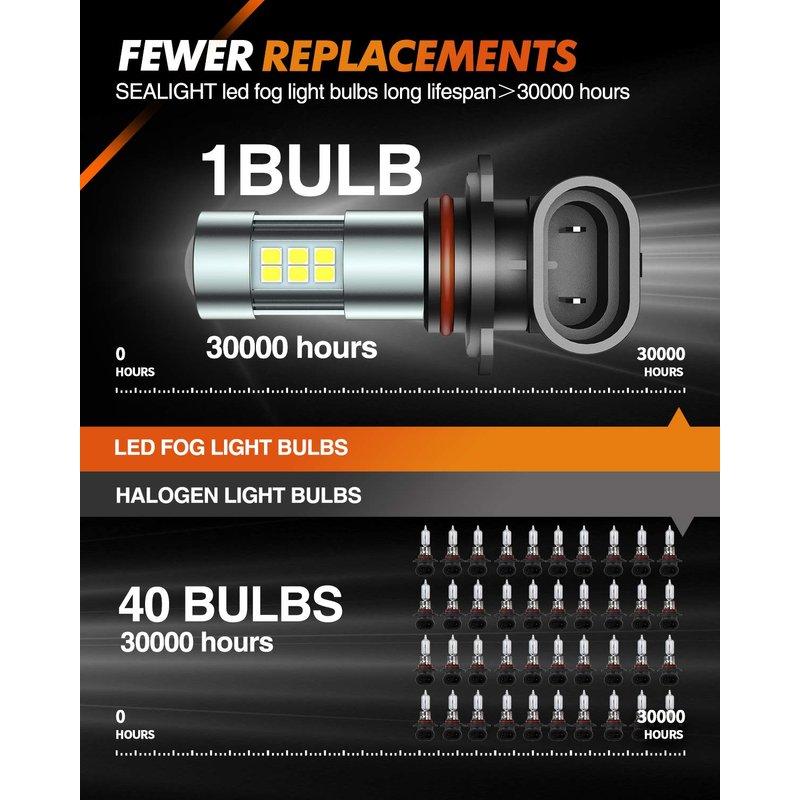 - Over 3,0000 Hours Lifespan: All-in-one aluminum material has strong heat dissipation capacity, get 1 SEALIGHT fog light, equivalent to 150 halogen bulbs. This will be the fog lamp that will accompany you for the longest time