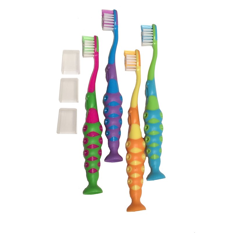 Fun design with suction cup feet will keep kids sticking to their twice-a-day routine. These brightly colored brushes feature soft bristles that are rounded and polished to provide effective brushing without damage to the gums. Assorted colors. Brush Head Length: 1"inch, Width: 1/2" inch wide. Brush length: 6.25" inches from suction base to top of brush head.