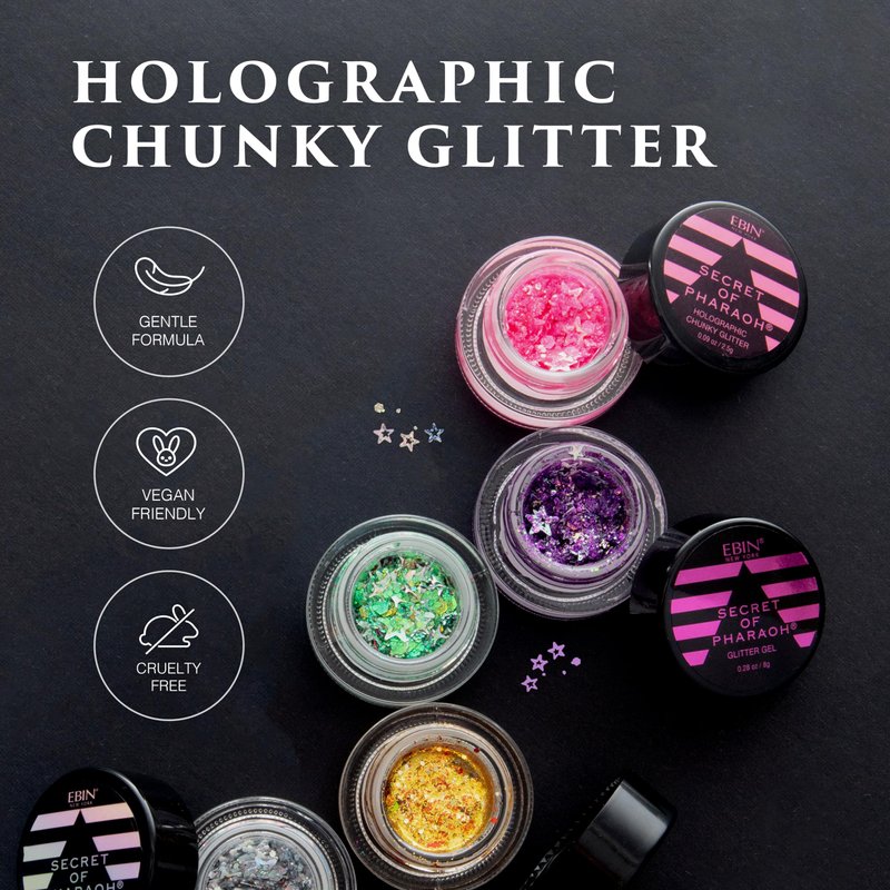 Secret of Pharaoh Chucky Glitter a dazzling array of transformative glitter that will ignite your imagination and add a touch of magic to your daily makeup routine. The captivating chucky glitter gel that has shimmering blends of fine iridescent and mulit-dimensional chucks leave you feeling like a true enchantress.