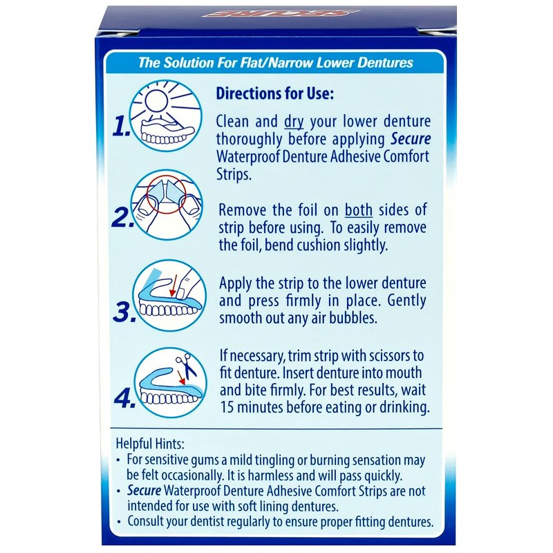 Secure Comfort Strips Waterproof Denture Adhesive - Zinc Free - Extra Firm Hold For Lower Dentures - 15 Count (Pack of 2)