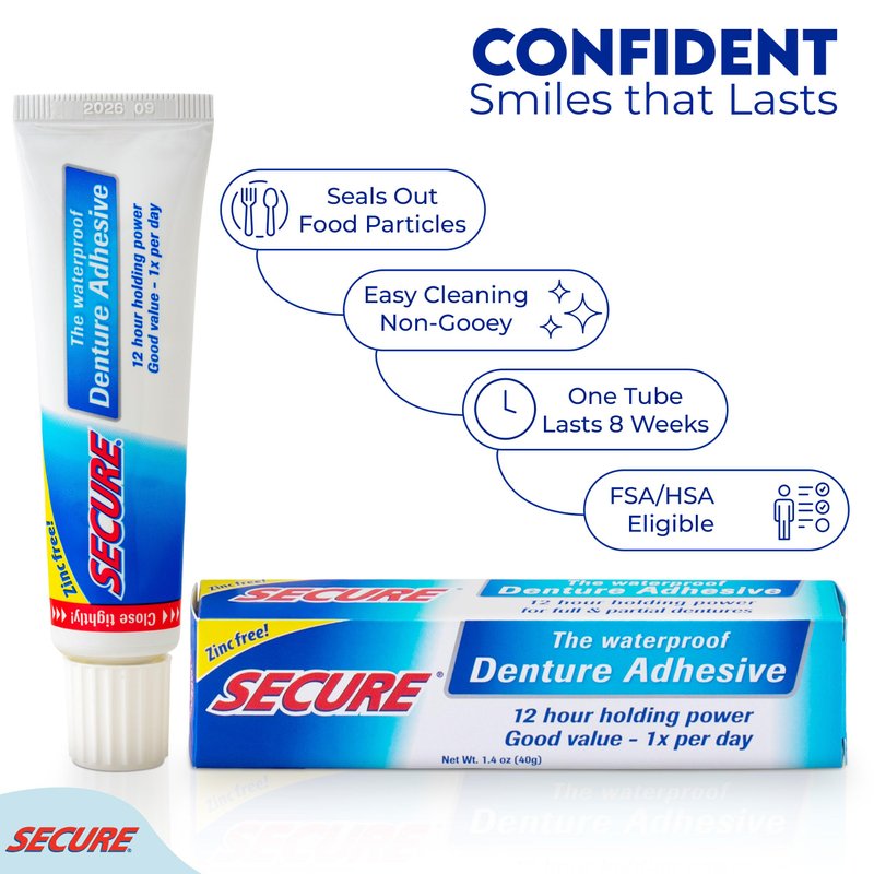 Secure Waterproof Denture Adhesive - Zinc Free - Extra Strong 12 Hour Hold - 1.4 oz (Pack of 2)