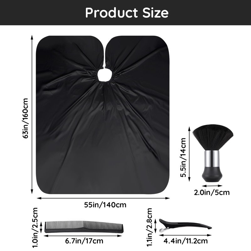 Package List: Includes 1x black waterproof haircut cape (55x63inch/140x160cm) with adjustable neck, 1x duster brush, 1x comb, 1x hairpin.