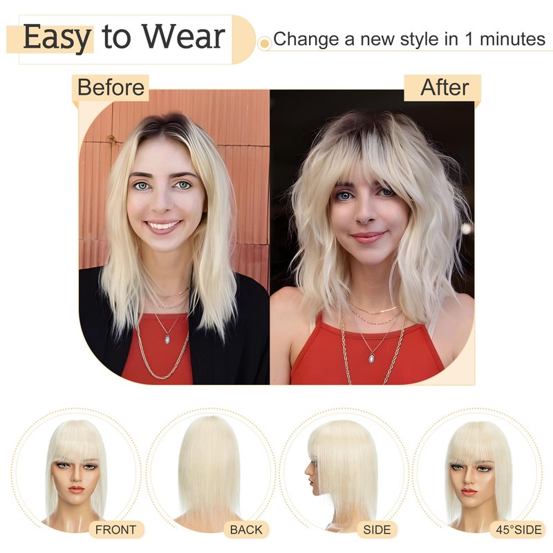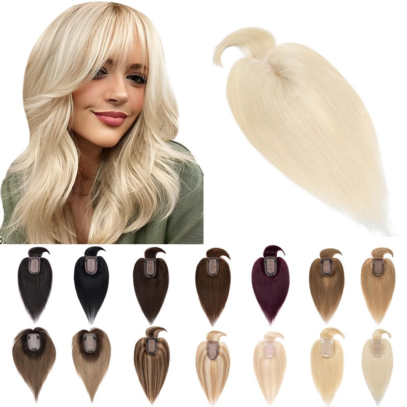 SEGO Hair Toppers for Women Real Human Hair With Bangs 7 * 13CM Silk Base 100% Remy Human Hair Clip in Top Wiglet Hair Pieces for Thinning Hair /10 Inch Platinum Blonde